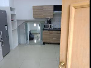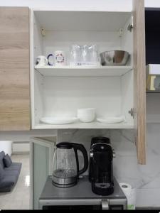Die Gäste können Mahlzeiten in der komplett ausgestatteten Küche zubereiten. Diese beinhaltet Kochgeschirr, Herdplatte, Mikrowelle, Kühlschrank, Kaffeemaschine sowie Wasserkocher und Tee-/Kaffeekocher, zudem gibt es einen Essbereich mit Esstisch für komfortables Speisen. Zusätzliche Annehmlichkeiten umfassen Steckdosen am Bett für mehr Komfort sowie kostenfreies WLAN im gesamten Apartment.